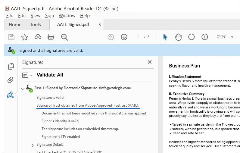 - Mentions source of Trust obtained from Adobe Approved Trust List (AATL)